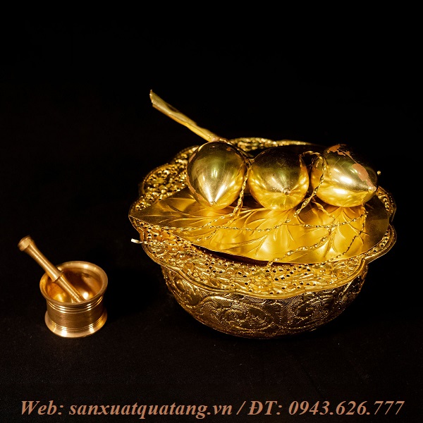 Bộ trầu cau bằng đồng thờ cúng gò thủ công được dùng để bày biện trên bàn thờ gia tiên thay cho đĩa trầu cau thông thường vì độ bền đẹp tiện lợi không sợ bị hỏng, mất màu theo thời gian.